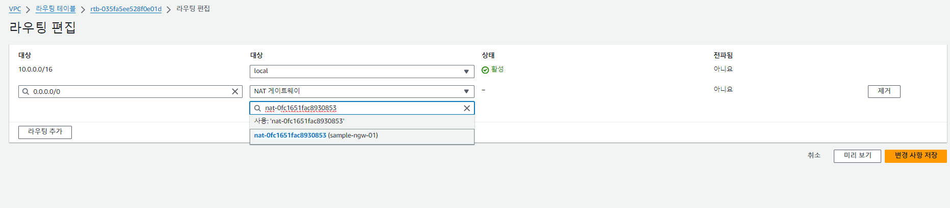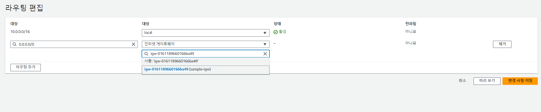 퍼블릭 igw에 라우팅테이블을 추가한다