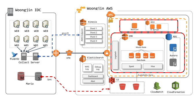 - 수집된 데이터는 Amazon S3에 저장 후, Amazon Elasticsearch Service를 통해 시각화.
