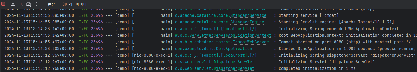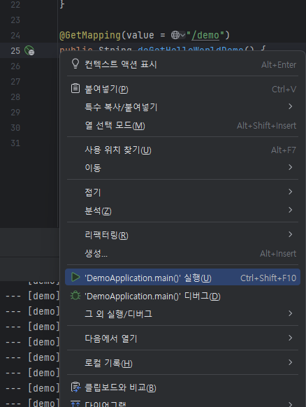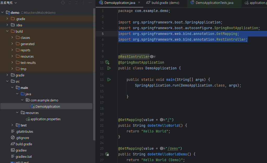 demo > src > main > java > com.example.demo > DemoApplication 파일에 아래 Hello World" 코드를 추가합니다.
