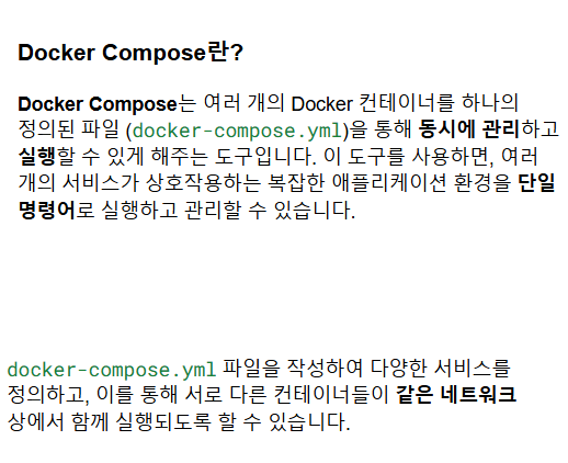 알고보니개념을 잘못이해고 있었다. compose 한개의 이미지를 컨테이너를 실행하는게 아니라 한번의명령어를 통해