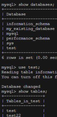 이 명령어는 mysql-container 컨테이너에서 MySQL 클라이언트를 실행합니다. 비밀번호를 입력하라는 메시지가 표시되며, rootpassword를 입력하면 MySQL 쉘에 접속할 수 있습니다.