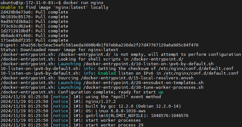 ubuntu@ip-172-31-0-83:~$ docker run -d --name mynginx -p 80:80 nginx