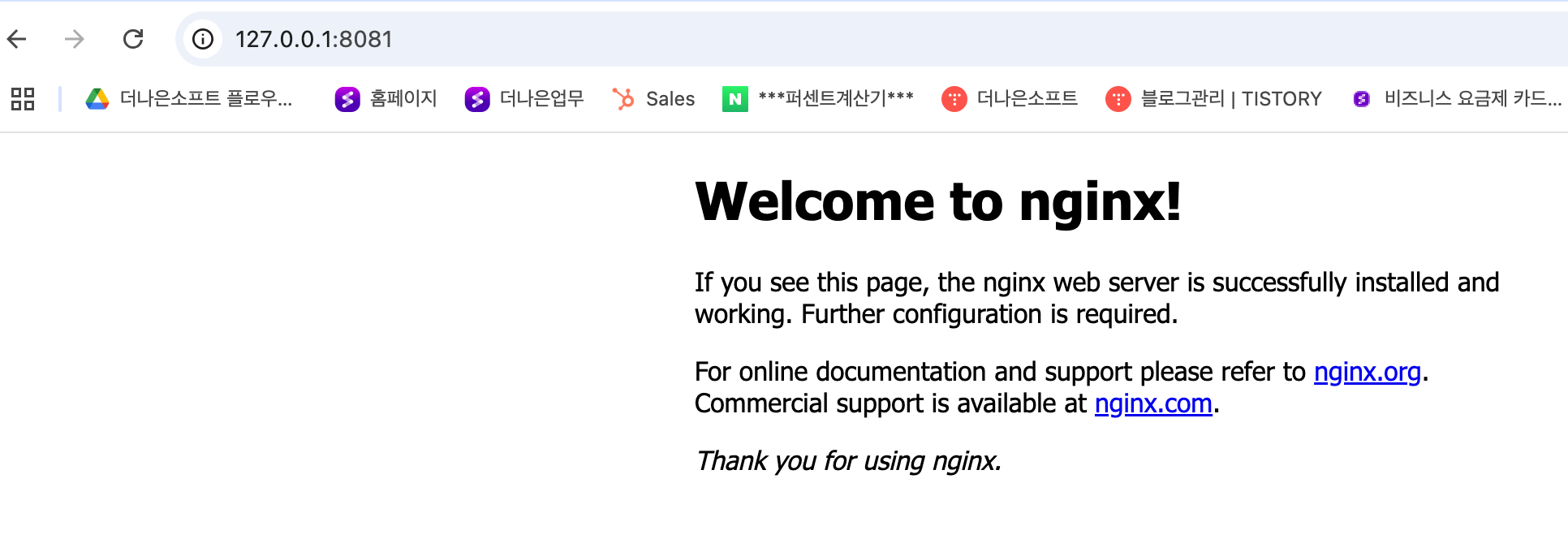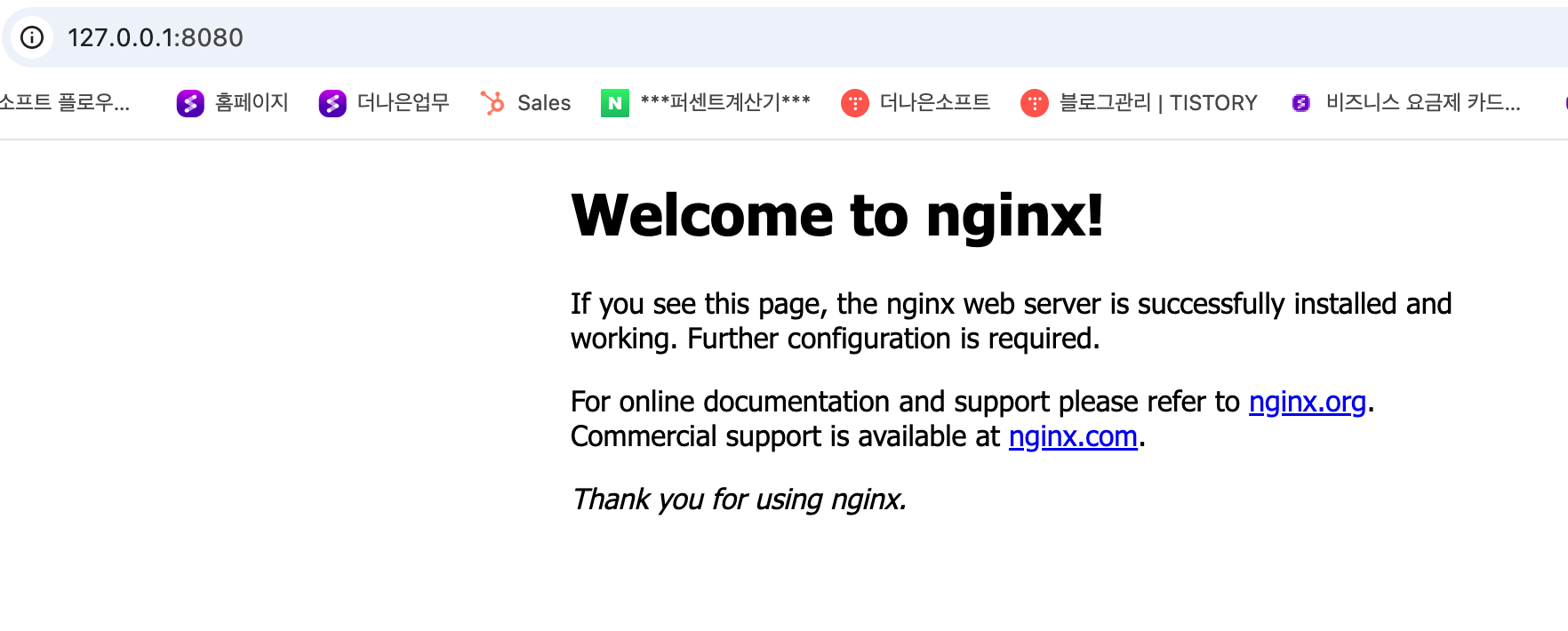 이렇게 하면, 호스트 시스템의 127.0.0.1:8080에서 요청을 받으면, Docker 컨테이너의 80 포트로 전달되어 nginx 서버가 응답하게 됩니다.