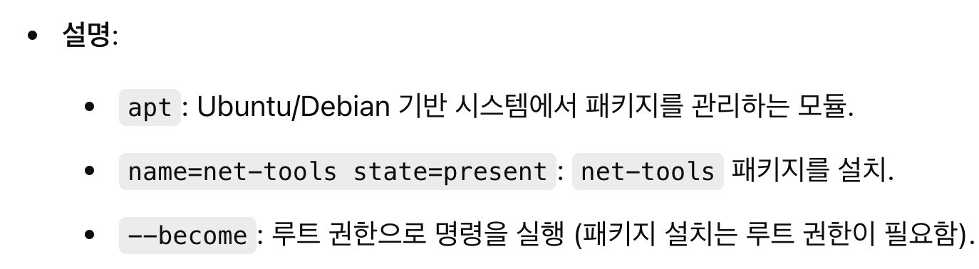 - 호스트 그룹화: Ansible에서는 여러 서버를 그룹으로 묶어서 관리할 수 있습니다. 예를 들어, 여러 대의 ubuntu_servers 그룹을 만들어 하나의 그룹으로 명령을 실행할 수 있습니다.