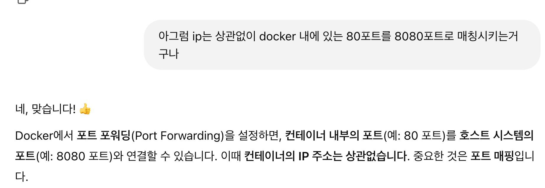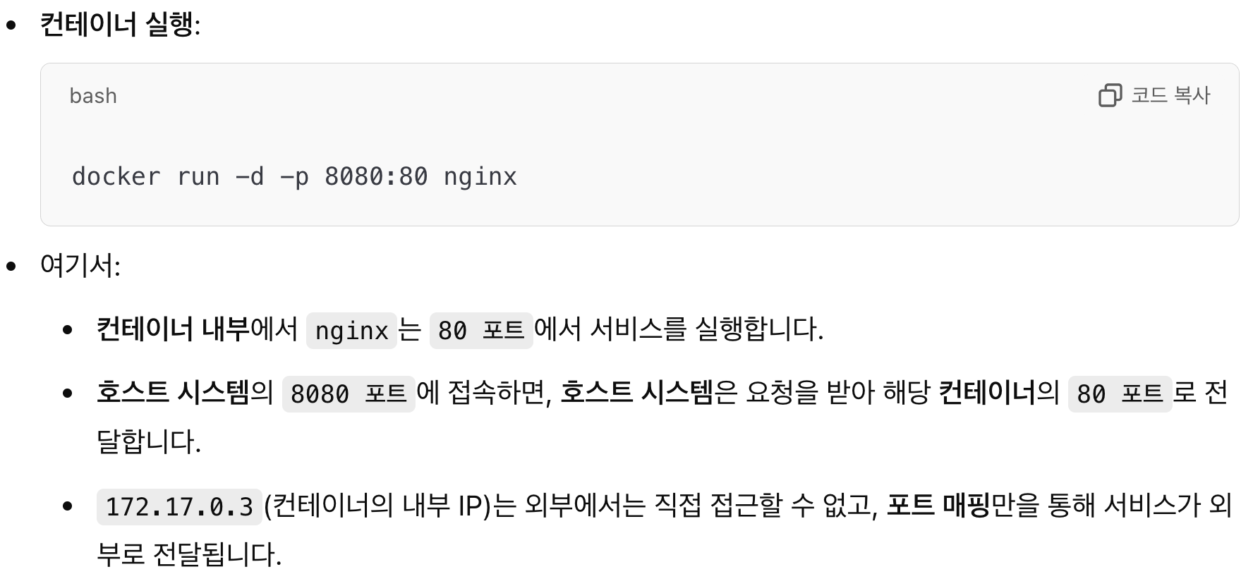 즉, 호스트의 포트 8080으로 요청을 보내면, 그 요청은 컨테이너의 포트 80으로 전달되어, 그 안에서 실행되는 웹 서버(예: nginx)가 응답을 하게 됩니다. 컨테이너 내부 IP는 실제로 외부에서 접근하는 데 사용되지 않습니다.