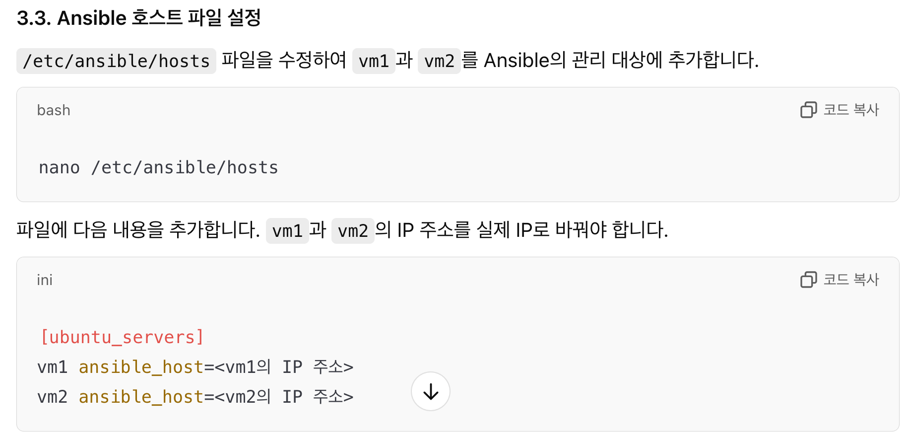 /etc/ansible/hosts 파일을 편집하는 이유는 Ansible이 관리할 대상 서버들을 지정하기 위함입니다. Ansible은 기본적으로 /etc/ansible/hosts 파일에 정의된 호스트 목록을 사용하여 원격 서버에 명령어를 실행합니다.