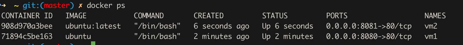 ➜ test git:(master) ✗ docker run -it -d --name vm2 -p 8081:80 ubuntu