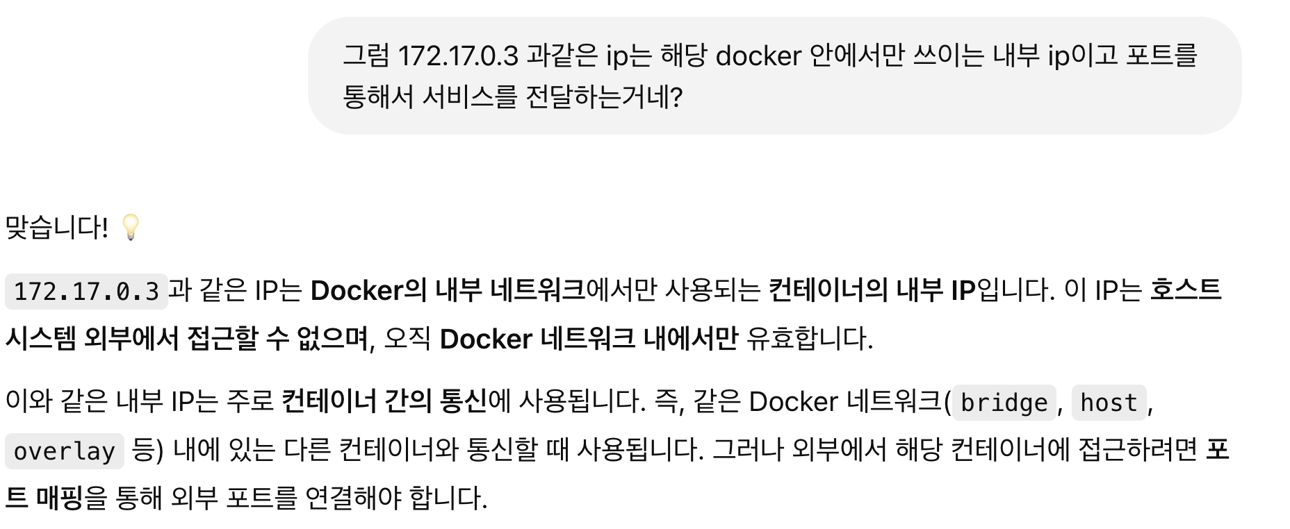- 컨테이너의 IP는 외부에서 접근할 때 필요하지 않으며, 포트 매핑만이 중요합니다.