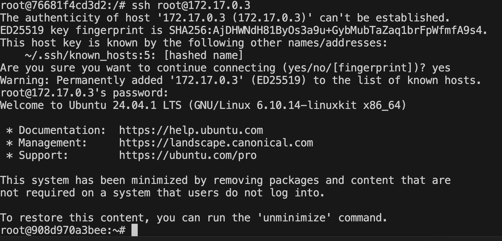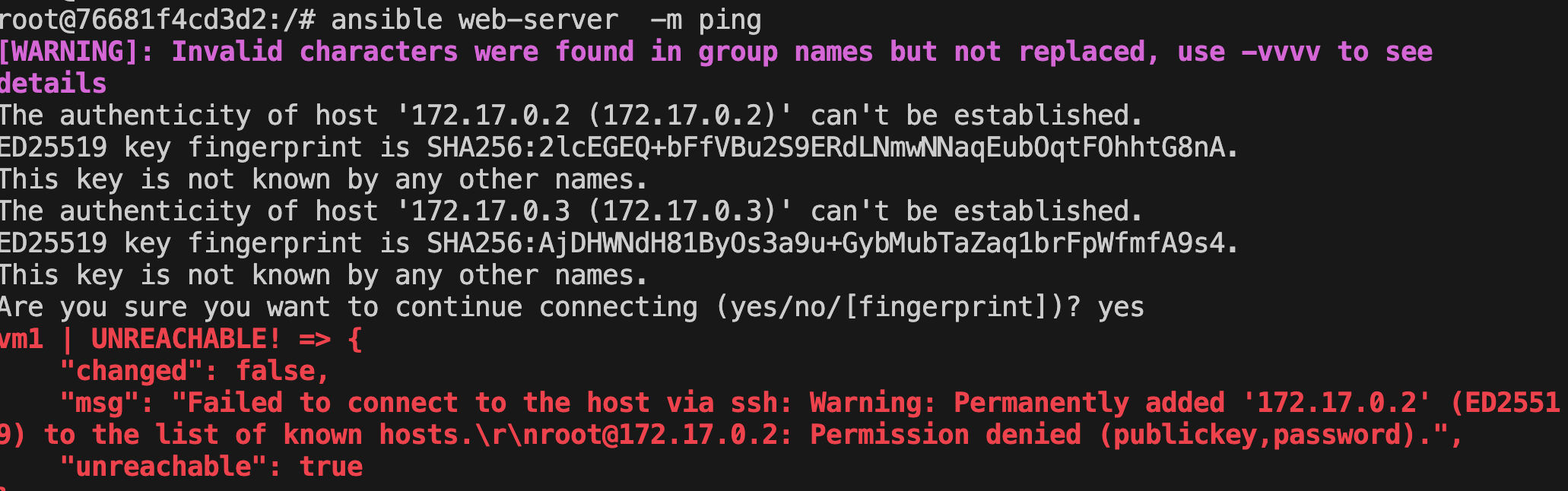 3. 각 컨테이너 ssh설정, 같은네트워크 설정, ansible-server 접근하여 ssh 연결을 위한 host 설정
