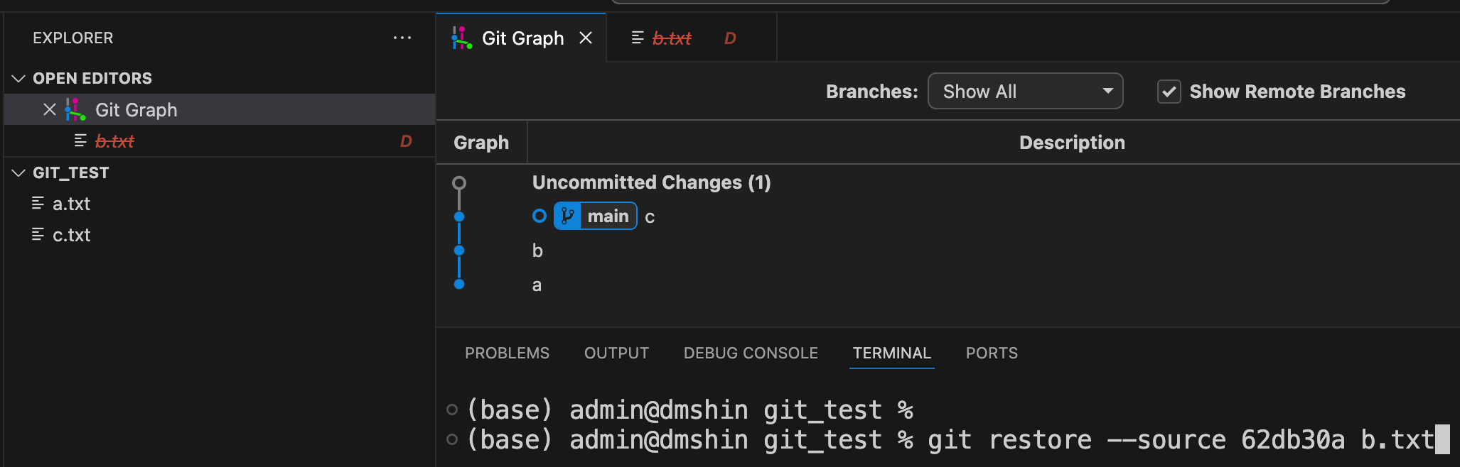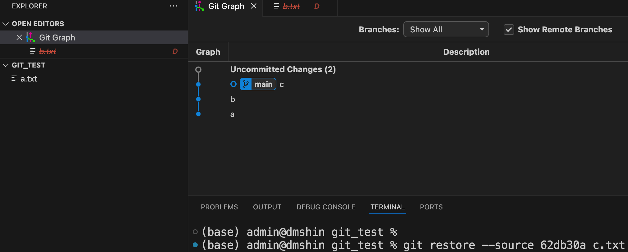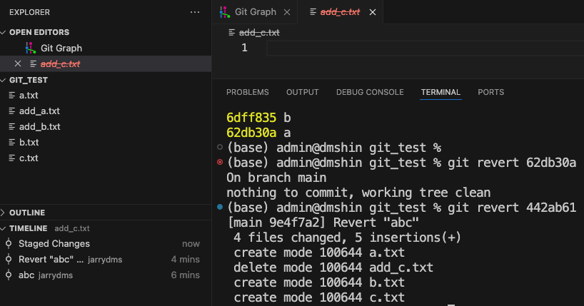 git resotre --source 62db30a c.txt //실행하면 c.txt도 사라졌다.
