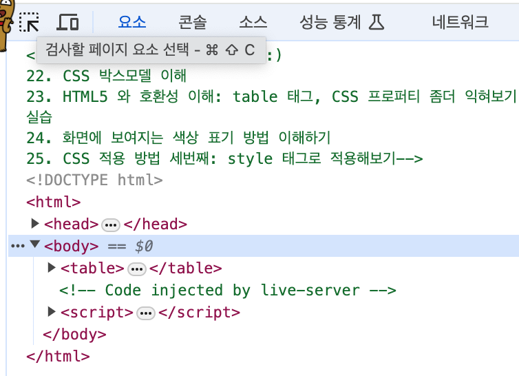 TIP. 검사할 페이지 요소를 선택할수 있습니다.
