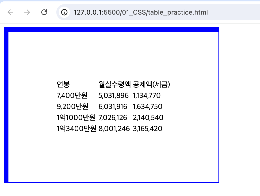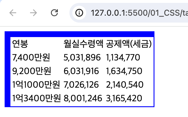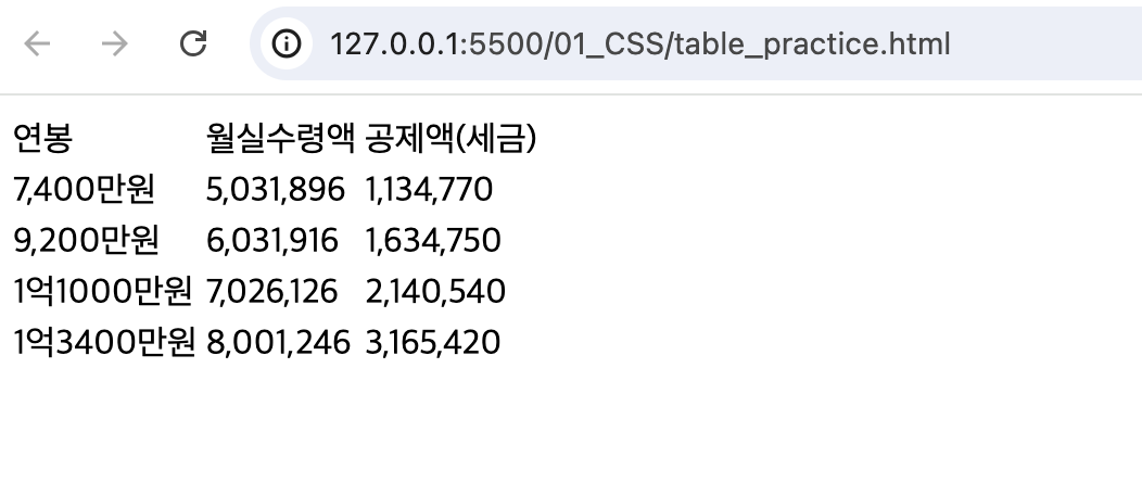 <td>연봉</td> <td>월실수령액</td> <td>공제액(세금)</td>