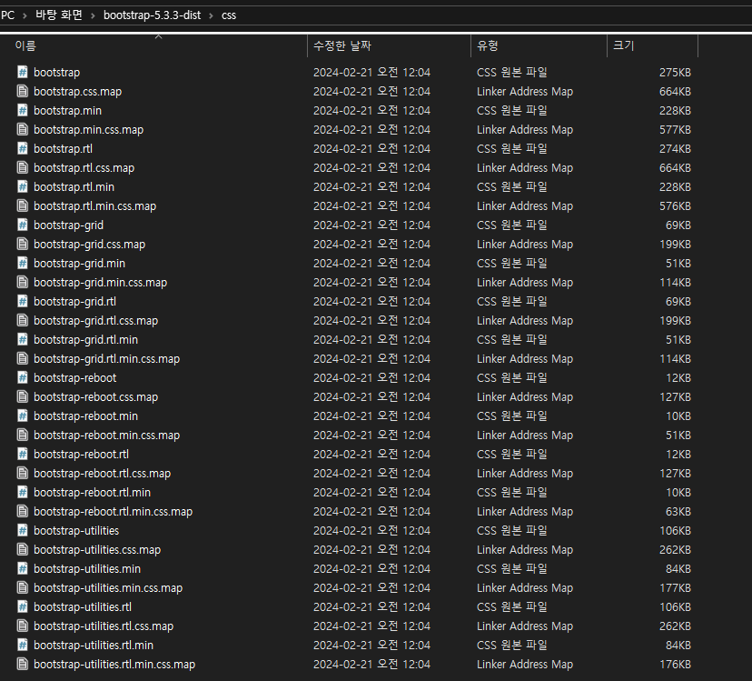 다운로드 완료후 css폴더를 열어보면 아래와같이 CSS파일들이 들어있다 열어보면